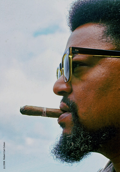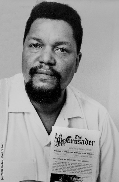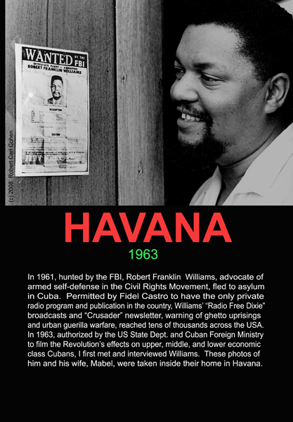 “HAVANA 1963| In 1961, hunted by FBI, Robert Franklin Williams, advocate of armed self-defense in the Civil Rights Movement, fled to asylum in Cuba. Permitted by Fidel Castro to have the only private radio program and publication in the country Williams’ “Radio Free Dixie” broadcasts and “Crusader” newsletter, warning of ghetto uprisings and urban guerilla warfare, reached tens of thousands across the USA. In 1963, authorized by the US State Dept. and Cuban Foreign Ministry to film the Revolution’s effects on upper, middle, and lower economic class Cubans, I first met and interviewed Williams. These photos of him and his Wife, Mabel, were taken inside their home in Havana.” Robert Carl Cohen